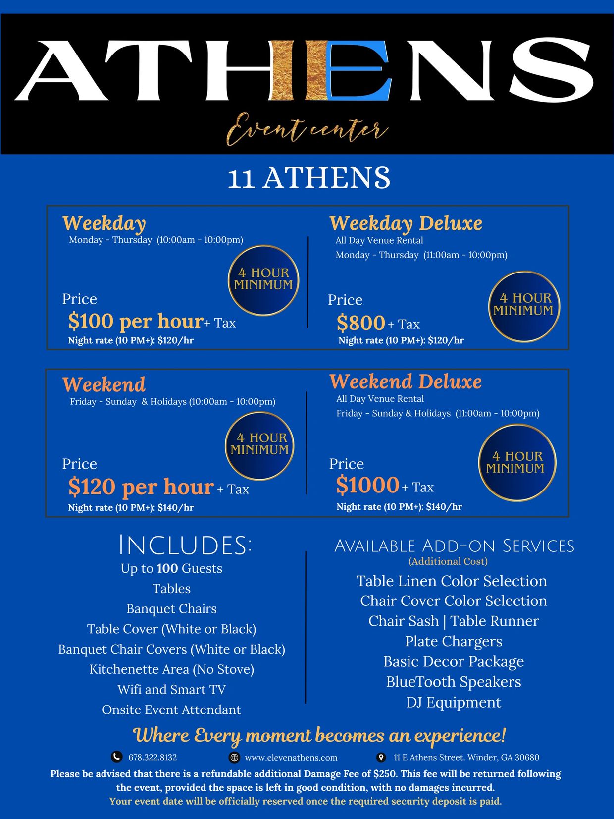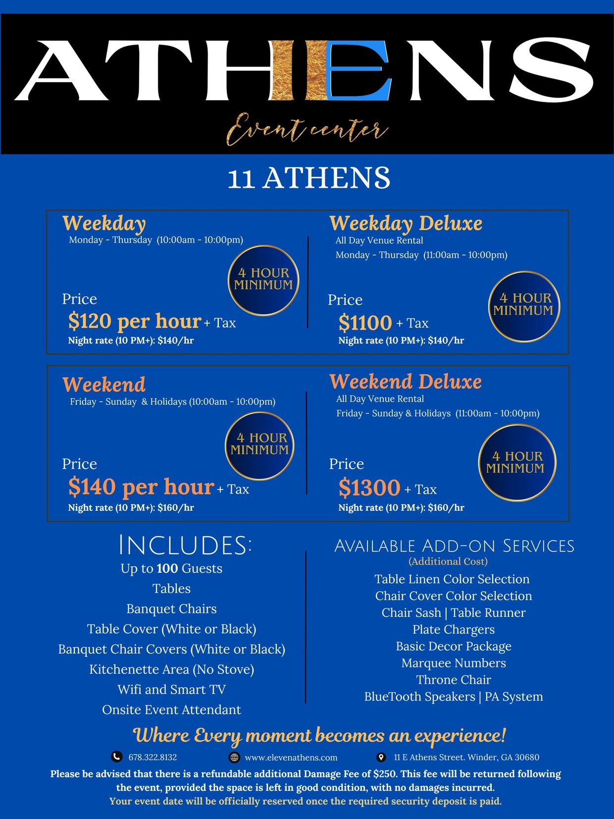 11 Athens is an event center located in the vibrant entertainment district of downtown Winder. Newly renovated, our versatile space is perfect for hosting a variety of events, from corporate gatherings to social celebrations.